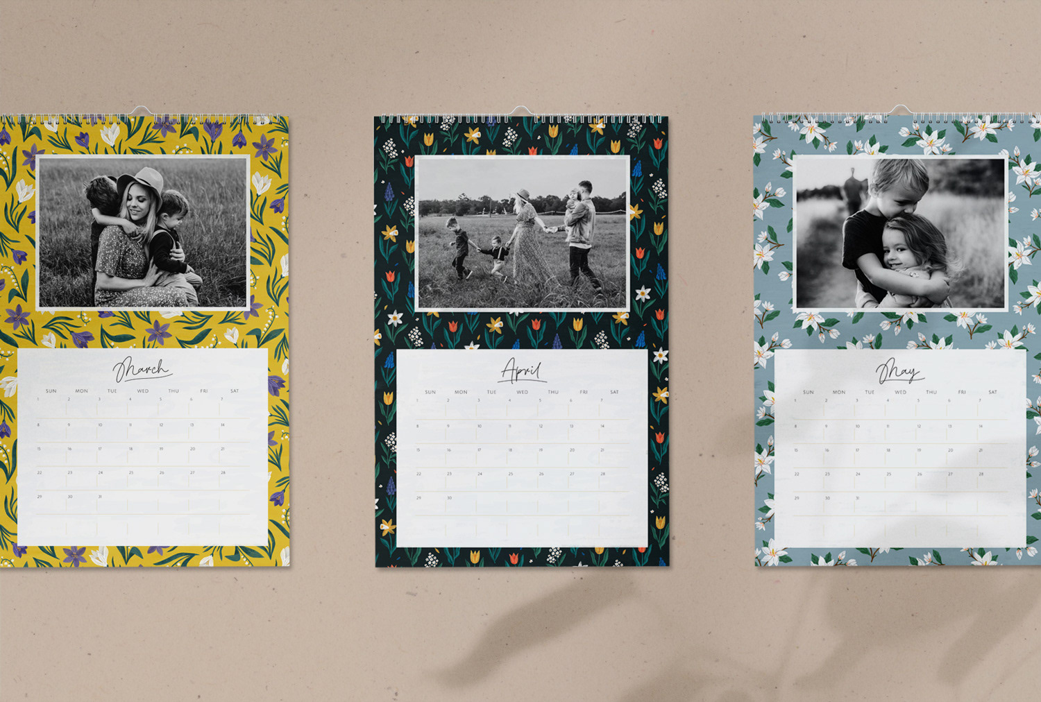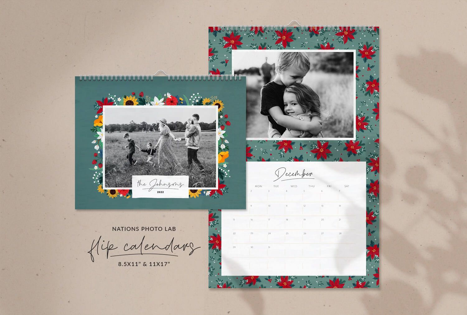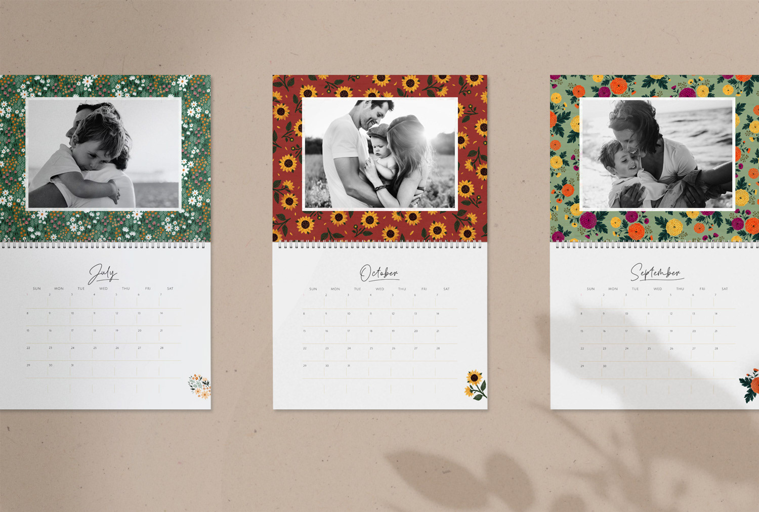 Customizable flip calendar (in 2 sizes) featuring patterns with seasonal florals.