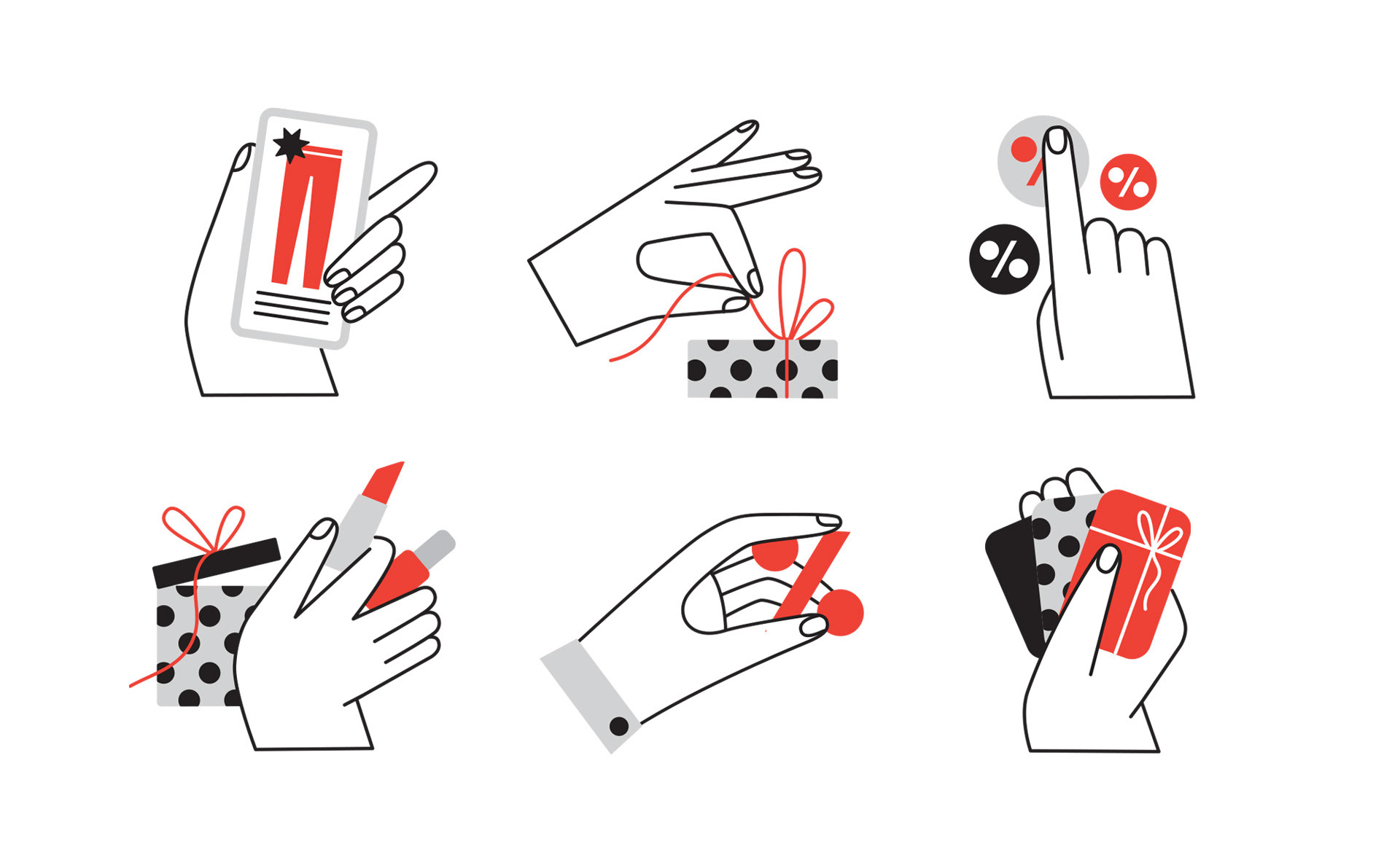 Set of icons for an article about ways to save on gifts during the holiday season.